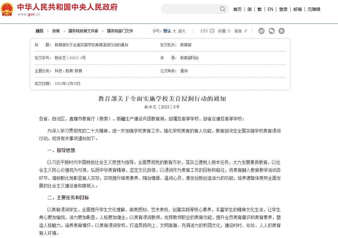 教育部印發(fā)《關(guān)于全面實(shí)施學(xué)校美育浸潤(rùn)行動(dòng)的通知》(教體藝〔2023〕5號(hào)),全面實(shí)施學(xué)校美育浸潤(rùn)行動(dòng),包括實(shí)施美育教學(xué)改革深化行動(dòng)、美育評(píng)價(jià)機(jī)制優(yōu)化行動(dòng)等,進(jìn)一步加強(qiáng)學(xué)校美育工作,強(qiáng)化學(xué)校美育的育人功能。此文件也為未來一段時(shí)間內(nèi),各個(gè)層面美育工作的開展指明了方向。加之之前《關(guān)于全面加強(qiáng)和改進(jìn)新時(shí)代學(xué)校美育工作的意見》文件內(nèi)容,藝術(shù)素質(zhì)測(cè)評(píng)的實(shí)施,有助于推動(dòng)學(xué)校開足開齊藝術(shù)相關(guān)課程及促進(jìn)教育教學(xué)改革相關(guān)工作。